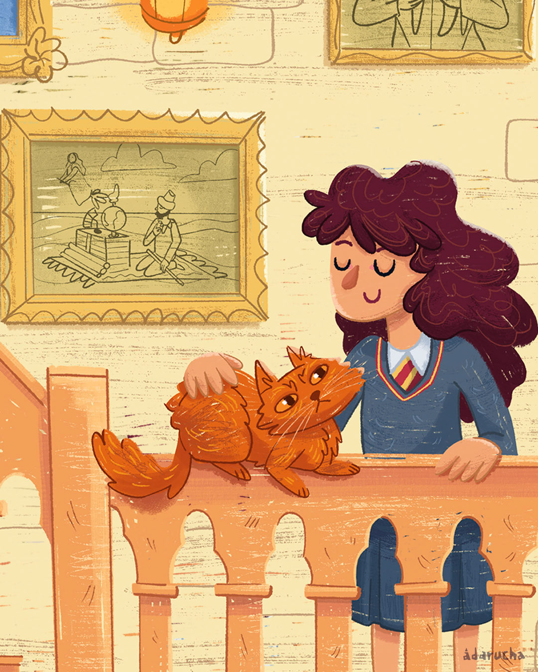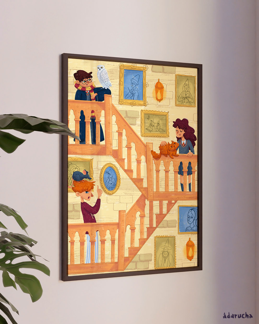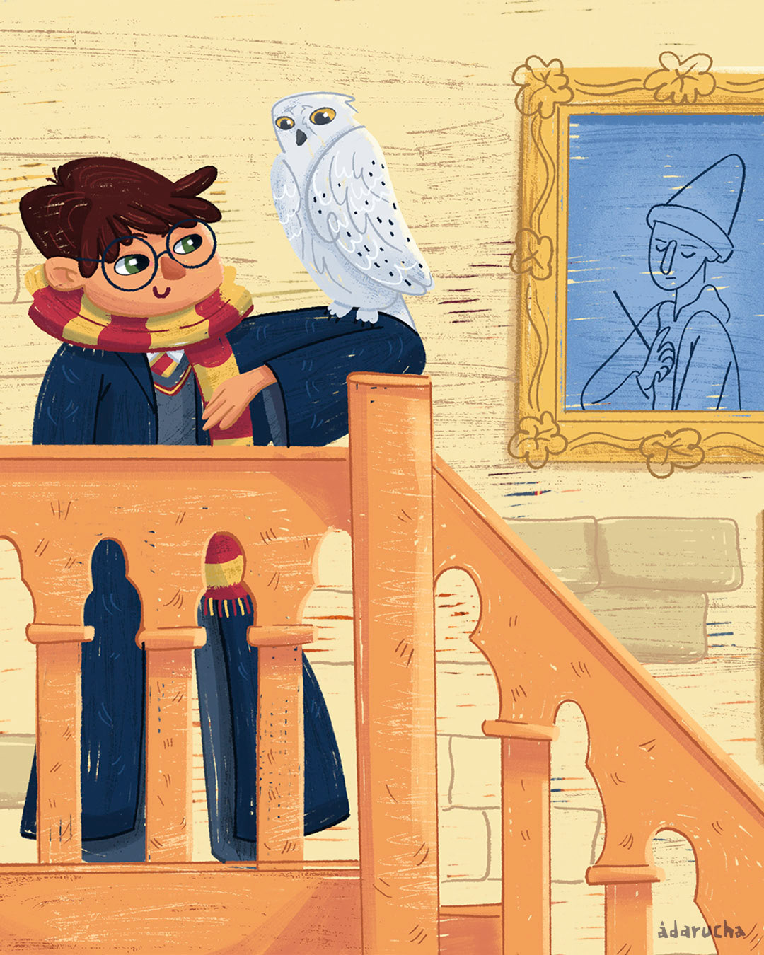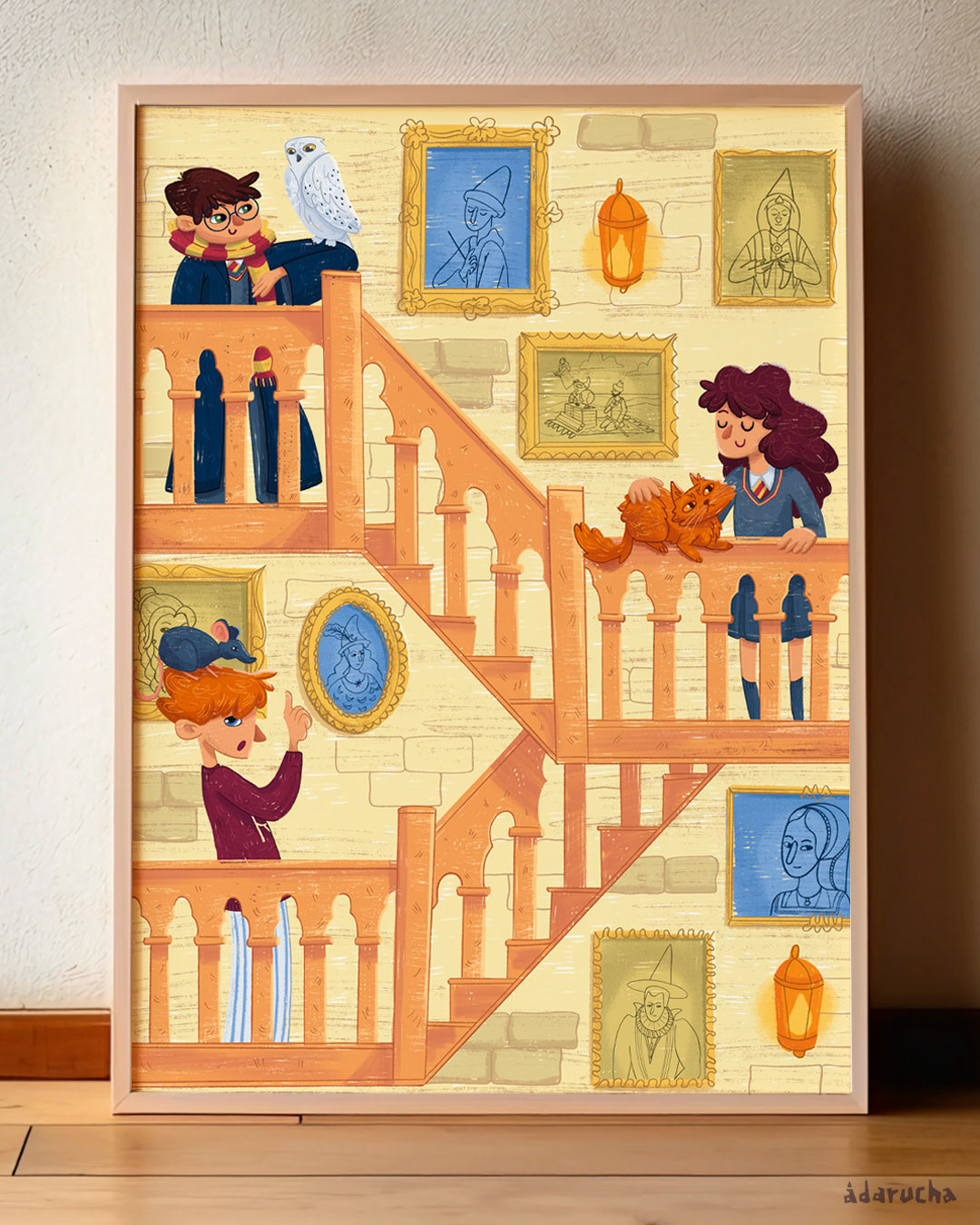 Una ilustración que hice sobre Harry, sus amigos y mascotas para poder llevarla a los mercadillos navideños y que acompañase a muchas personas en sus hogares.